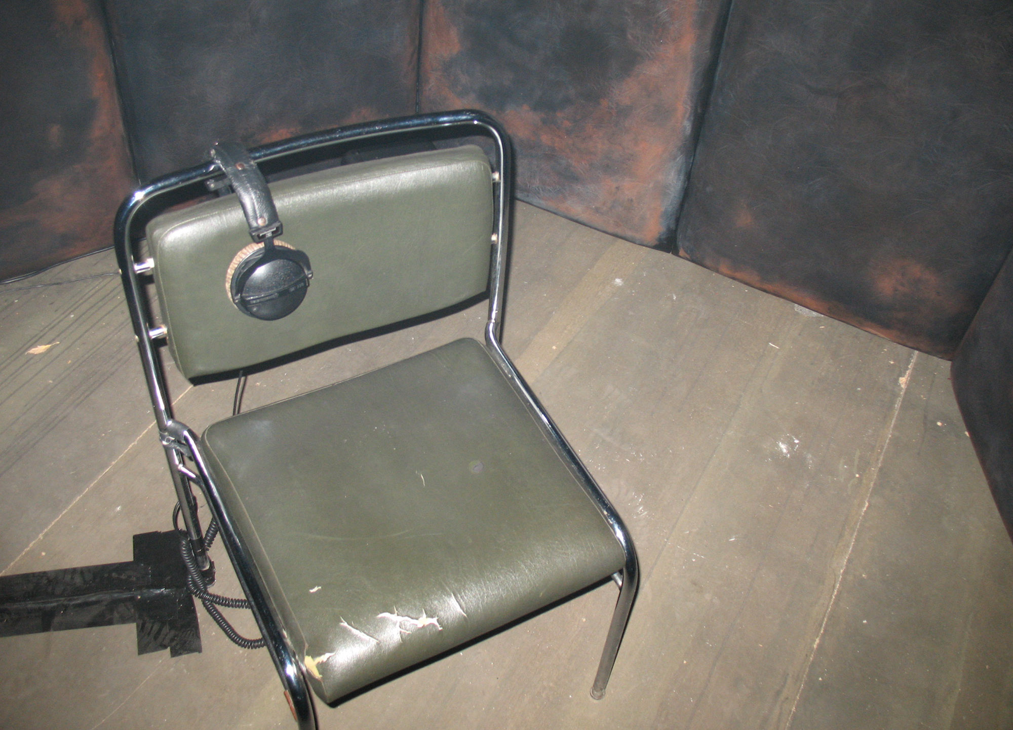 With the sounds he hears, steps, music, laughing people, knocking on the walls, it is not distinguishable whether they are coming from the headphones or really from outside the room. While the visitors eyes adapt to the pitchblack darkness in the room, a fragmented narrative begins, about a person in a room, listening to sounds coming from somewhere outside, trying to get some orientation about where he is, what's outside, what happened... Eventually, the chair under the listeners back begins to shake.